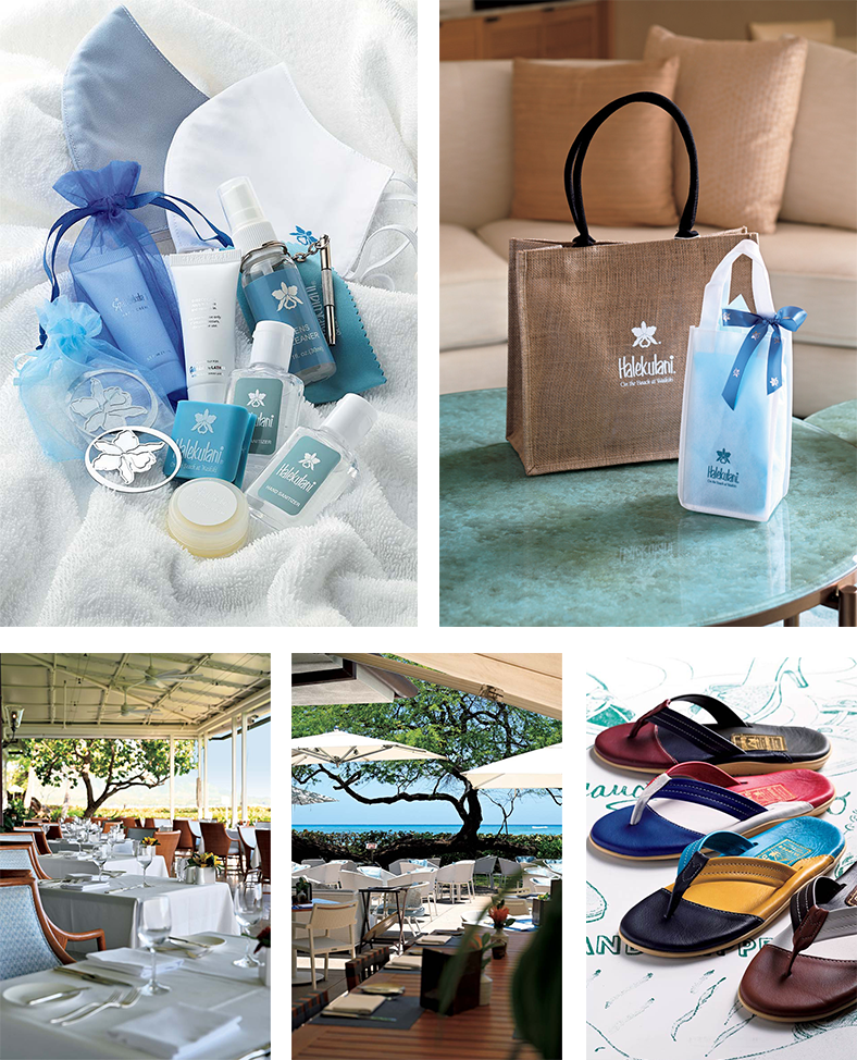 写真上左/ハレクラニロゴ入りグッズの盛り合わせ。写真上右/麻テイストのバッグ(時期によって変更あり)、ロゴ入り不織布バッグに入れたハレクラニグッズ盛り合わせをプレゼント。毎朝の朝食は、海辺のレストランとして人気の「オーキッズ」(写真下左)でのアメリカンブレックファスト、または何十種類もの料理がズラリと並ぶ「ハウス・ウィズアウト・アキー」(写真下中央)の朝食ブッフェを選べます。さらにさらに、「大人のハワイ」定期購読者(新規お申し込み者含む)の方には、現地ハワイで使える「アイランドスリッパ」(写真下右)の$50割引券を1組1枚プレゼント。